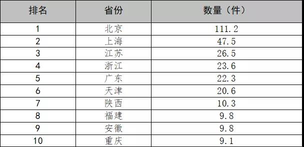 截至2018年底,我國國內(不含港澳臺)發明專利擁有量共計160.2萬件,每萬人口發明專利擁有量達到11.5件。我國每萬人口發明專利擁有量排名前3位的省(區、市)依次為:北京(111.2件)、上海(47.5件)、江蘇(26.5件)。