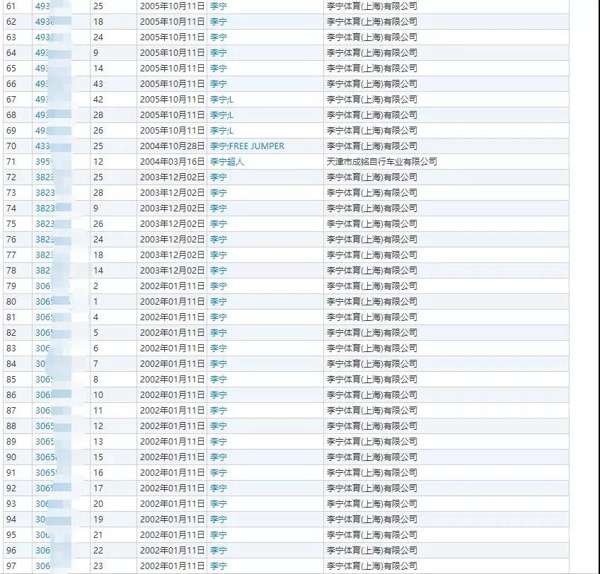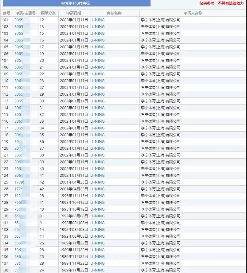 李寧(Li-Ning)部分商標(biāo)注冊(cè)情況截圖