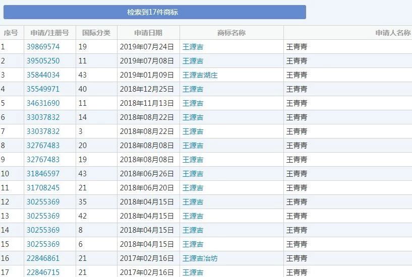 目前,王青青已經申請保護了17件“王源吉”商標,涵蓋6、8、11、14、21、35、42等多個類目。