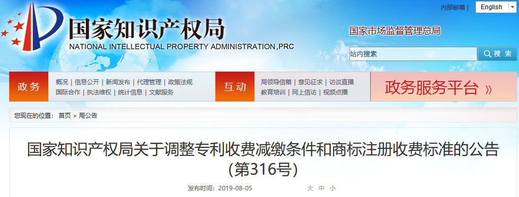 國家知識產權局關于調整專利收費減繳條件和商標注冊收費標準的公告(第316號)