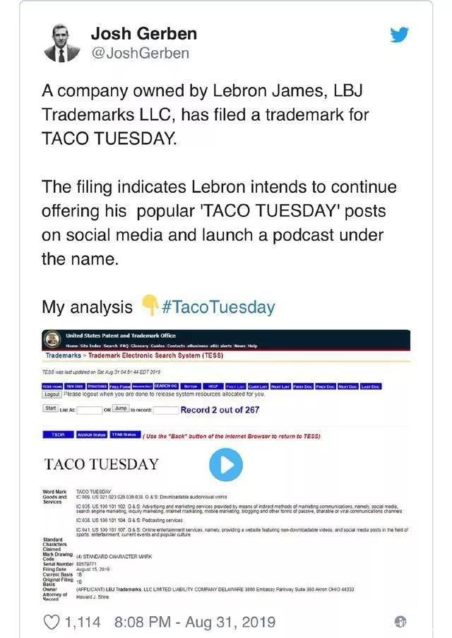 炒作之余,詹姆斯也看到了商機,隨即就對Taco Tuesday進行了商標注冊。據(jù)Gerben報道,詹姆斯的公司在8月15日就提交了該申請,但直到近日該申請才在美國國家專利和商標官方數(shù)據(jù)庫中公示出來。據(jù)美國商標主管部門官網(wǎng)顯示的信息,詹姆斯的公司為“Taco Tuesday”一詞申請的商標用途包括用作播客名稱、在體育娛樂及流行文化領(lǐng)域發(fā)布內(nèi)容涉及該詞匯的在線視頻和社媒帖子、廣告用途、可下載的聲音圖像視頻內(nèi)容等。