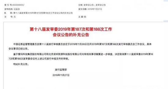 據報道,11月27日晚間,證監會官網公告稱,鑒于愛瑪科技集團股份有限公司尚有相關事項需要進一步核查,決定取消11月28日第187次發審委會議對其發行申報文件的審核。