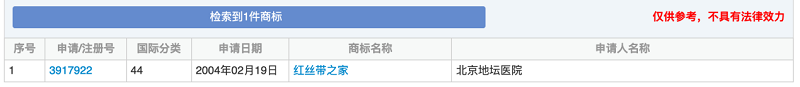 據商標網查詢,北京地壇醫院只申請了一件商標,該商標為44類3917922“紅絲帶之家”商標,目前處于等待實施審查狀態。