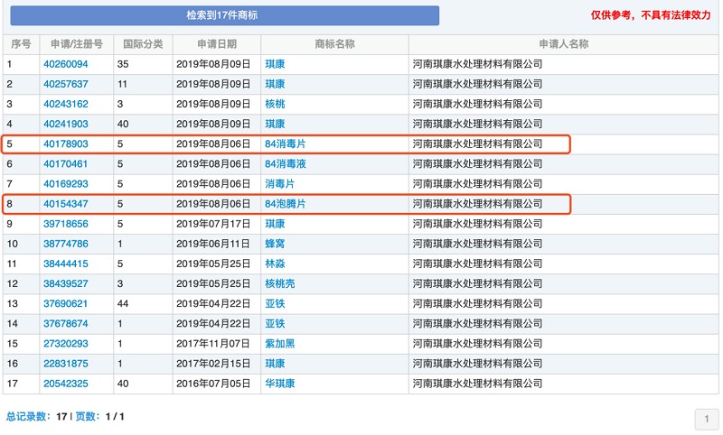 該公司除了這件商標,還曾申請過“84泡騰片”、“84消毒片”商標,但目前都處于等待實質審查狀態。