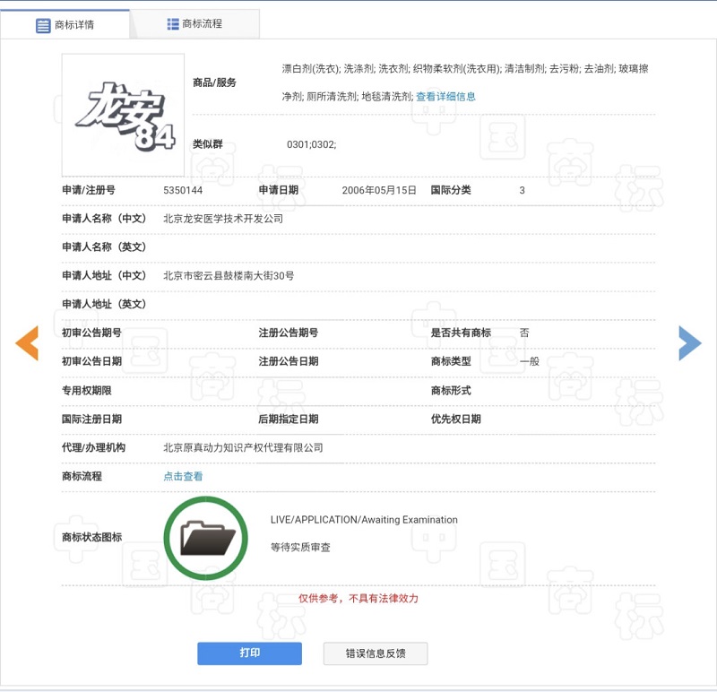 5350144號第3類“龍安84”商標目前還處于等待實質審查狀態,該商標指定使用于洗滌劑、洗衣劑、清潔制劑等。