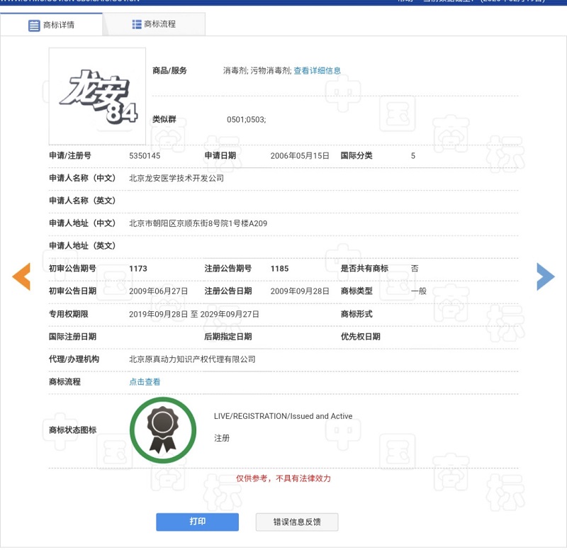 5350145號第5類“龍安84”商標注冊成功,該商標指定用于消毒劑、污物消毒劑等商品。