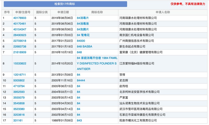 此外,筆者還在商標網上查詢了有關“84”字樣且為第5類的申請商標,共計17件,其中名為“84”的第5類申請商標有7件。