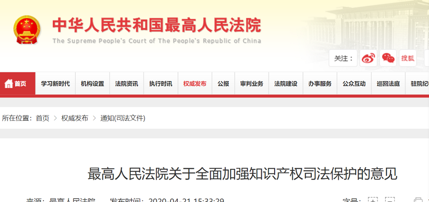 最高院印發《關于全面加強知識產權司法保護的意見》(全文)