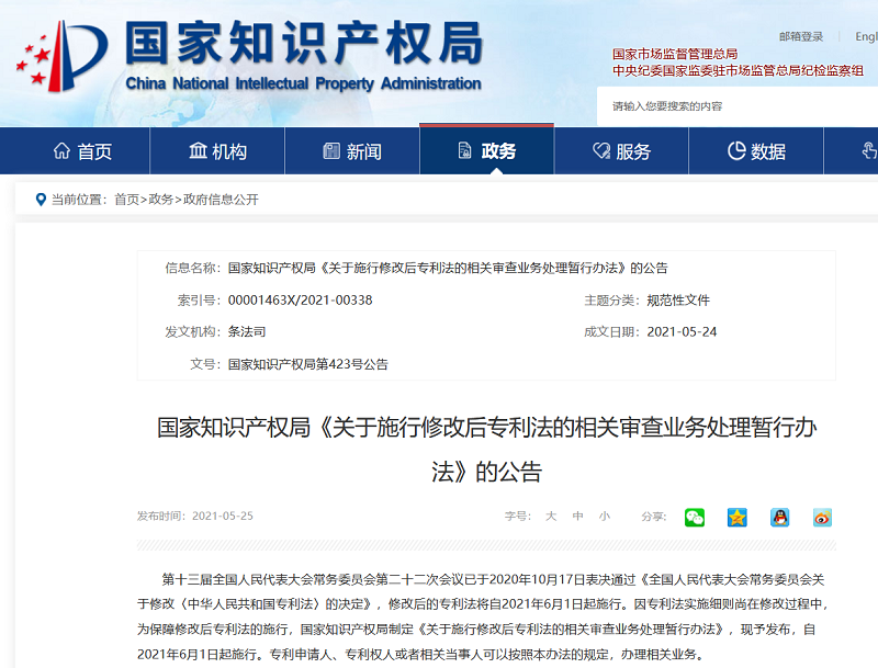 第十三屆全國人民代表大會常務委員會第二十二次會議已于2020年10月17日表決通過《全國人民代表大會常務委員會關于修改〈中華人民共和國專利法〉的決定》,修改后的專利法將自2021年6月1日起施行。因專利法實施細則尚在修改過程中,為保障修改后專利法的施行,國家知識產權局制定《關于施行修改后專利法的相關審查業務處理暫行辦法》,現予發布,自2021年6月1日起施行。專利申請人、專利權人或者相關當事人可以按照本辦法的規定,辦理相關業務。