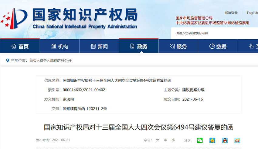 國家知識產權局對十三屆全國人大四次會議第6494號建議答復的函