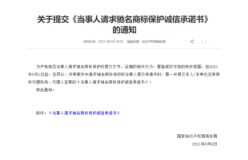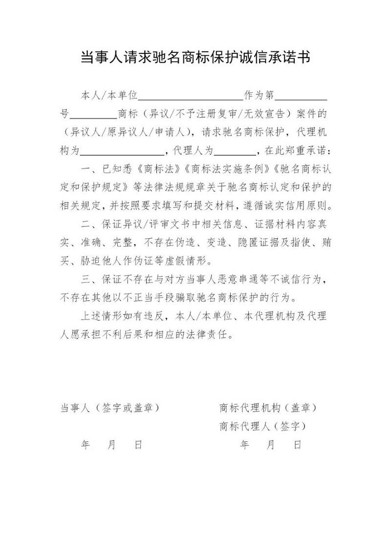 為嚴格規范當事人請求馳名商標保護時提交文書、證據的相關行為,營造誠實守信的良好氛圍,自2021年9月1日起,在異議、評審案件中請求馳名商標保護的當事人提交申請書時,需一并提交本人/本單位及其商標代理機構、代理人簽章的《當事人請求馳名商標保護誠信承諾書》。