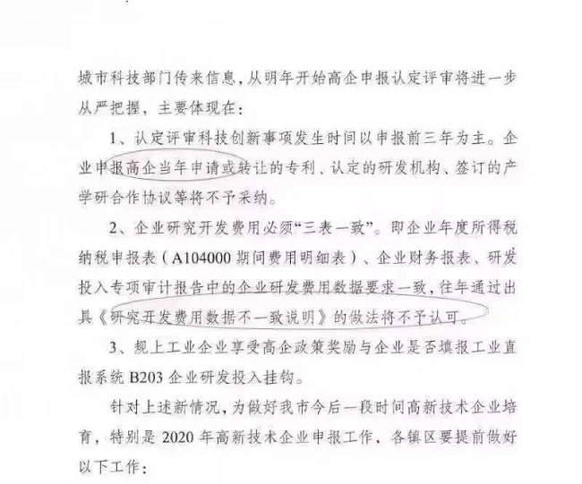 企業研究開發費用必須“三表一致”。即企業年度所得稅納稅申報表(A104000期間費用明細表)、企業財務報表、研發投入專項審計報告中的企業研發費用數據要求一致,往年通過出具《研發費用數據不一致說明》的做法將不予認可。 雖然未全省開始推廣,但極有可能是2020年高新技術企業的政策趨勢,想在2020年申報高新認定的企業,要抓緊時間做好提前準備工作。提前做好培育,專利不能再臨時抱佛腳,必須要提前一年做好準備;財務方面針對研發費用的要求也將會更加嚴格,不再是出具相應證明可以解決相應問題,必須保持”三表一致“原則。