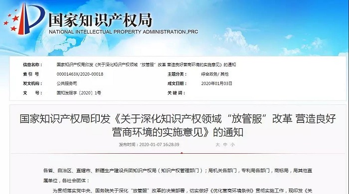 國家知識產權局印發《關于深化知識產權領域“放管服”改革 營造良好營商環境的實施意見》的通知
