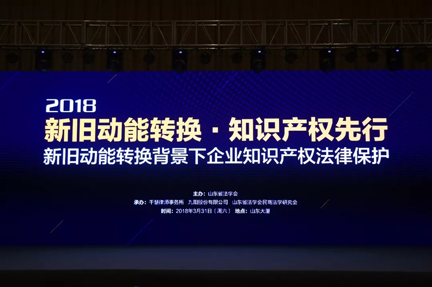 2018年3月31日,由山東省法學會主辦,千慧知識產權公司、九陽股份有限公司、山東省法學會民商法學研究會共同承辦的“新舊動能轉換背景下企業知識產權法律保護”主題論壇在山東大廈金色大廳舉行,最高人民法院,山東省高級人民法院,濟南市中級人民法院的法官和山東大學法學院的教授們做精彩演講,全省300多位企業家,企業法務負責人和知識產權負責人參加會議,共同探討企業知識產權保護問題。